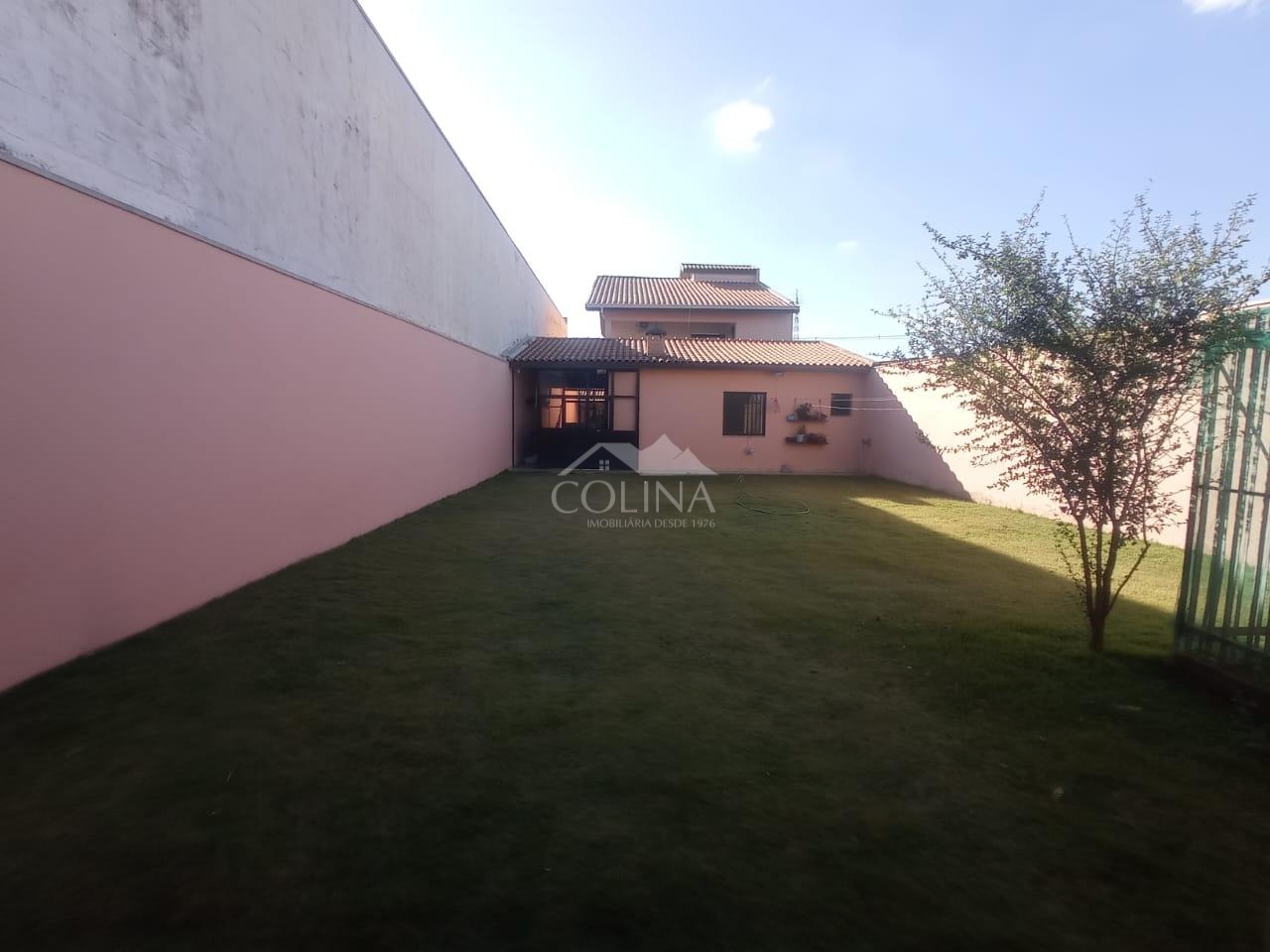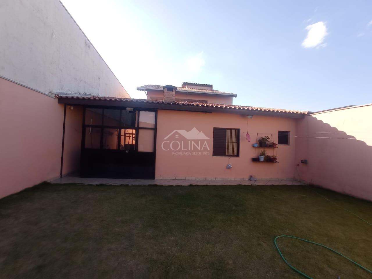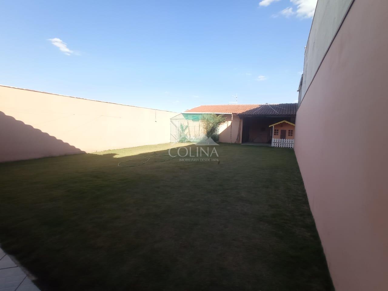 Na área externa, quintal gramado, edícula com depósito.