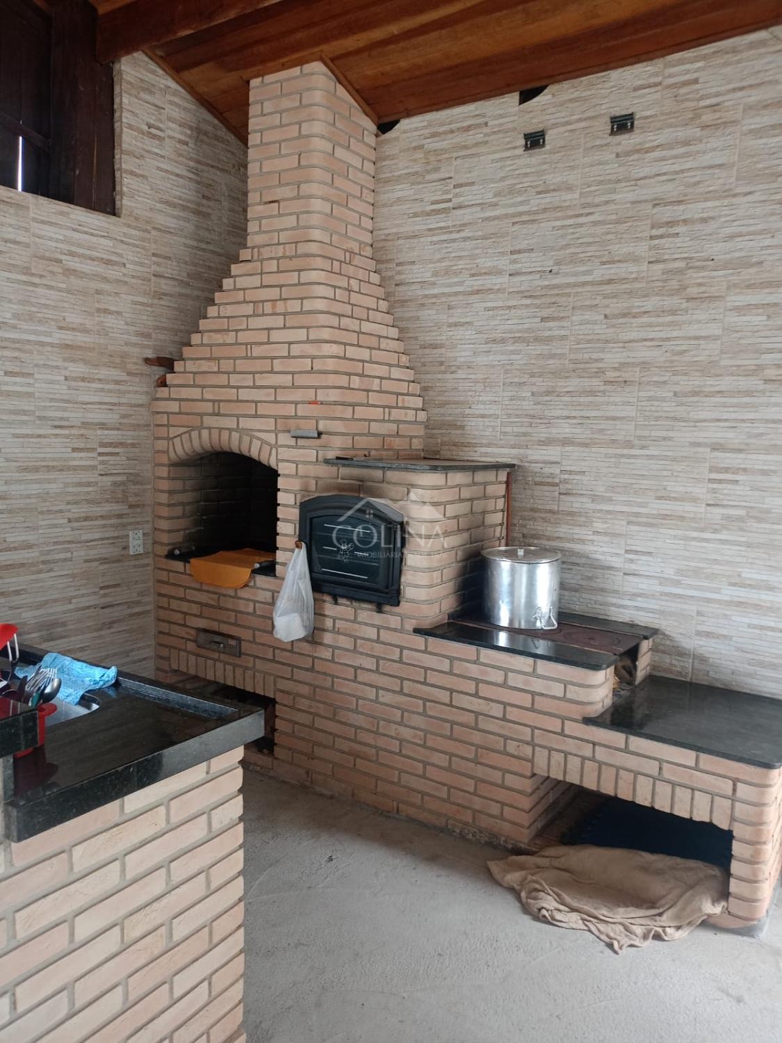 Área de lazer com churrasqueira, fogão a lenha, forno de pizza, banheiro e quartinho.